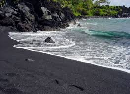 Located in Hawaii. The beach has black sand made of basalt and created by the lava slowing into the ocean, which explodes as it reaches the ocean and cools.